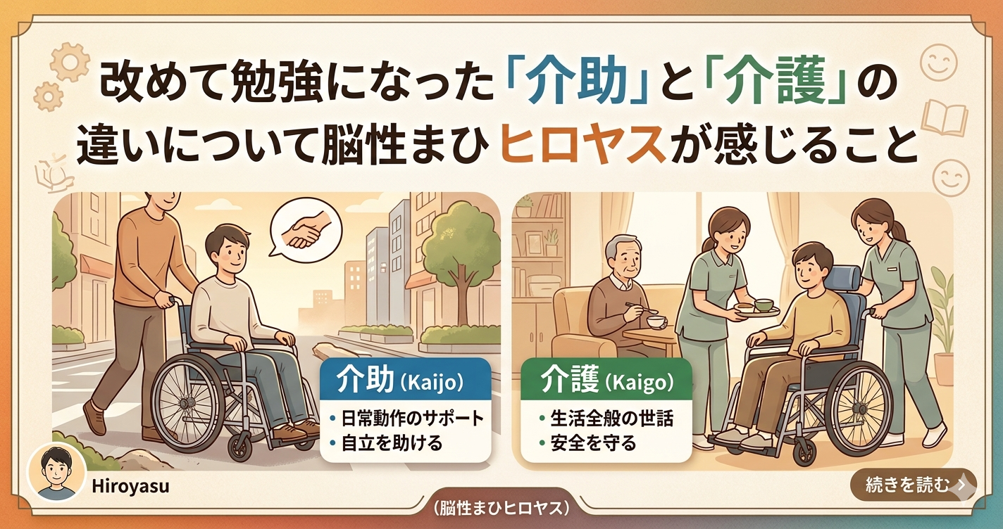 脳性まひの障がいがあって電動車いすで生活をしているぼくヒロヤスですが、ぼくが毎日、家族やヘルパーさんに手伝ってもらっているのは、「介助」なのか「介護」なのか、少し疑問に感じる部分があったので、今話題のGoogleのNotebookLMを使って「介助」と「介護」の違いについて調べてみました。そしたらかなり奥深くて勉強になりました。
